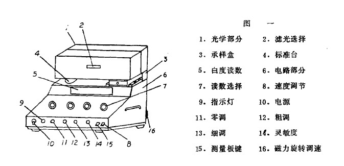 数显白度仪外形如图一所示,仪器由三部分组成。上部为光测量头,(由光源,滤色镜,聚光镜和硒光电池等组成。中部有受光器(接收来自光通道孔之光)二只,左面为标准试样处,右面为被测纤维承样盒(有磁性电转动机构支托)。介于光源和承样盒之间有红、绿、蓝三色滤光镜籍以对各种波长的吸收和通过再经聚光后由第二滤光片的透明度来分别消除反射来的紫外线和其它不纯光线而被紫外线激发了荧光波长各为红(614m产)、绿(522m产)、蓝(440m严)进入硒光电池。第三部分为电路组成。由于读数选择采用了标准电阻给定。避免了用滑线电阻示值所造成的临界误差,从而可完整地直接在数码管读出被测物的白度值。