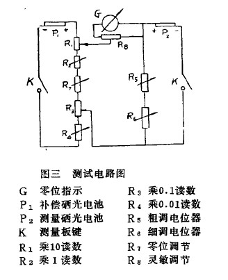 数显白度仪采用二组硒光电池作为桥臂,组成测试电路(图三),光源束以45.角度分别投至标准样面和被测物面上。在垂直于平面的方向(法线)由二组硒光电池接收试样及标准样品反射的光通量。试样的白色程度将直接影响其硒光电池的输出电流大小,二者成直线关系。