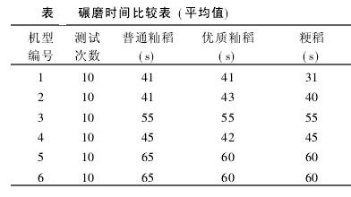 从碾米时间的比较试验中可以看出, 1号和2号样机的碾米时间在31 s~43 s之间,平均为37 s.3号和4号机的碾米时间在42 s~55 s之间,平均4815 s; 5号和6号机的碾米时间在60 s~65 s之间,平均为6215 s.
