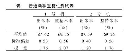 分别用普通籼稻、优质籼稻和粳稻作为台间差的测试样品,每份样品重复测定10次,每份试样16 g,碾米精度按三等米的要求。测定结果取10次测定平均值。样机对普通籼稻、优质籼稻和粳稻的出米率和整精米率台间差均小于110%.