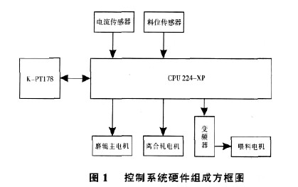 2.1 控制系统硬件设计说明本控制系统核心 CPU 采用西门子 224XP,喂料辊调速采用西门子 420 变频器, 进料斗传感器采用德国 E+H 单杆电容式传感器, 电流传感器采用北京科海电流模块。输入设备采用西门子 K- PT178 触摸屏, 可以直接控制磨辊主电机的启动、停止; 手动、自动工作方式的切换; 离轧、合轧单独动作的执行及总停机; 并可显示磨辊主电机电流及吸收功率, 超额定电流报警等; 还可显示喂料辊电机的转速, 各种工作方式指示等。