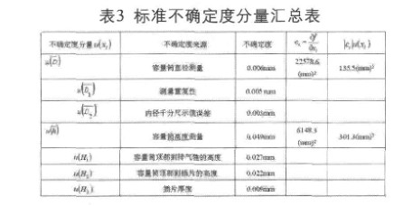 (4)温度计的误差引起的不确定度容重器校准时所用的温度计分度值为0.1℃,最大允许误差为±0.2℃。由于水的体积膨胀系数为2.1×10-4/℃,因而温度计的误差引入测量结果最大允许误差为±(0.2×2.1×10-4),由此引入的不确定度可忽略不计。