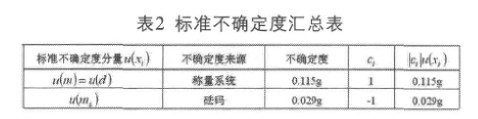 2.2.2 合成标准不确定度计算由于输入量 与 彼此独立不相关,根据公式(2)g2.2.3 扩展不确定度的评定取包含因子 =2,容重器称量系统在1,000g称量点校准结果的扩展不确定度