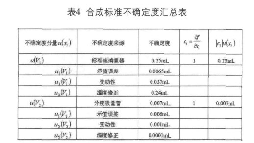 (3)温度系数引起的不确定度 根据《JJG 196-2006常用玻璃量器检定规程》,检定或校准是在室温20℃±5℃条件下进行。检定室的温度通常为20℃±2℃,设试验环境为22℃,不进行温度修正,液体的体积膨胀系数远大于玻璃,因此只需考虑前者即可。水的体积膨胀系数为2.1×10-4/℃,产生的体积变化为±(2×5×2.1×10-4)= ±0.0002mL.半宽 = 0.0002mL,估计为均匀分布,