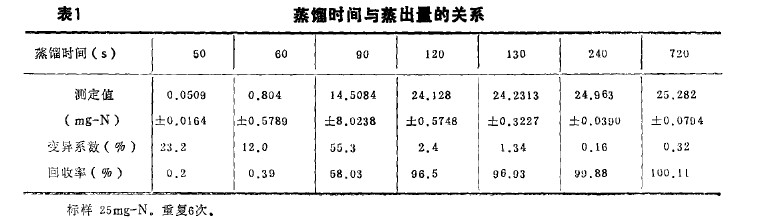 从图1可见,氨的蒸馏有个突变过程。在开始蒸馏后60一120秒钟内,氨的蒸出达9.%以上,而其余的10%延缓到50.一700秒钟才被蒸出。蒸汽凝结水的过程则为前期少而后期多,氨的浓度决定于氨的蒸出速率与凝结水量。表1结果表明,氨浓度前高而集中,处于过饱和状态,容易挥发,因而前期高效吸收蒸出的氨是很关键的。氨浓度后期低而逐渐递减,并延缓很长时间,所以延长蒸馏时间对氨的全回收以及减少残留是有益的。