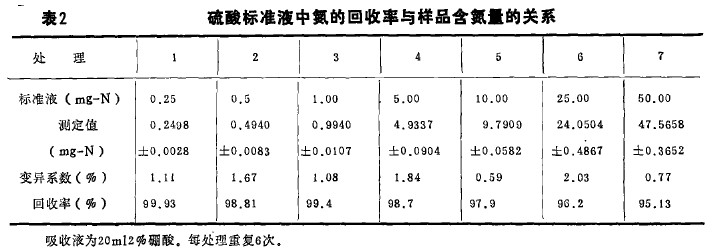 3.样品含氮量25一smg范围内,低氮量川硼酸吸收,lmg氮左右,其回收率可达99%,高氮量用硼酸加硫酸吸收,巧一somg二孔,其回收率一J.J达洲二。