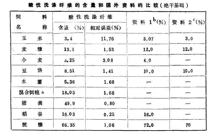 结语:此项工作对我们说来还只是一个开始,从所获结果与美国公布的同名饲料的教据比较,看来相差不远,但由于重复次教不多,数据少,要掌握好国外这一分析纤维素的新方法尚需进一步验证和试验。