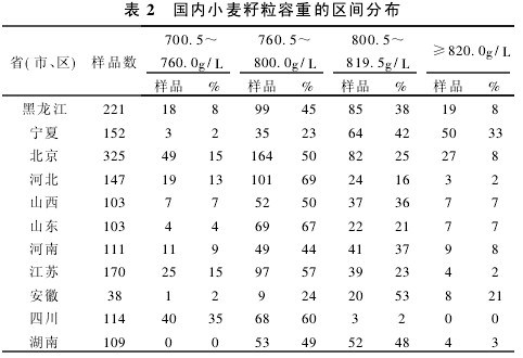 从各省(市、自治区)小麦品种籽粒容重测定结果的平均值看,大于800g/L的品种来自宁夏、安徽和湖南;四川小麦籽粒容重最小(763.0g/L)。