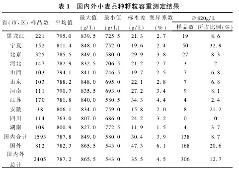 小麦籽粒容重属物理性状,是小麦品质的一项重要指标。它是籽粒大小、重量、形状、整齐度、腹沟深浅、胚乳质地、出粉率等性状和特征的综合反映[1].本文根据2405份栽培小麦籽粒的容重测定结果,比较国内外品种及国内各地品种容重的状况,统计分析了不同类型材料的容重值与蛋白质含量、沉降值和硬度的相关关系。本研究首次对如此大量的小麦品种进行系统的容重测定,以便为全面和综合评价小麦籽粒品质提供科学依据。