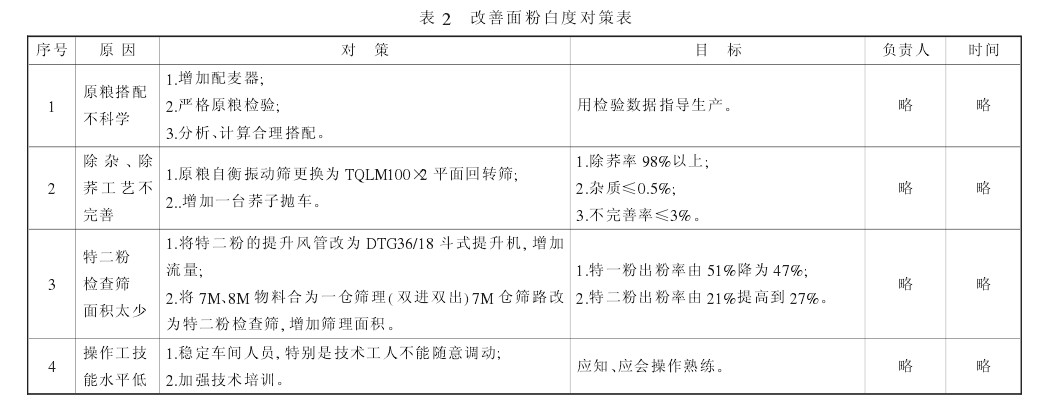 2) 加强职能管理。为彻底改善面粉白度指标,我们根据对策表, 全面制定整改计划。