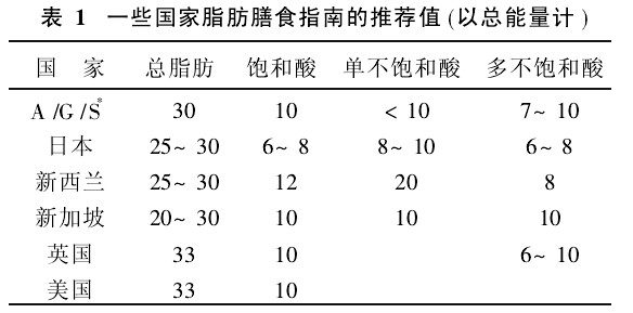 1968年,世界上第一个颁布膳食指南的国家是瑞典,该指南包括总脂肪的消费从占总能量的40%降到25% ~35%.同时指出饱和酸消费量应减少,相应增加多不饱和酸的摄入。随后大多数工业国家及有关国际组织推出相似的指南,对总脂肪、饱和酸/单不饱和酸/多不饱和酸、油酸/亚油酸/A-亚麻酸及X6/X3酸的比例提出了推荐值。需要指出的是脂肪膳食指南受诸如富裕程度、地方文化传统及饮食习惯的影响,所以不同国家有不同的推荐值[32-34],见表1.