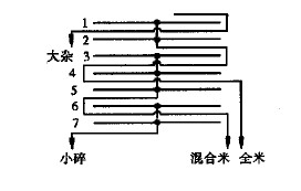MMPS60@7大米分级高方筛,最近由湘粮机械厂消化吸收日本佐竹公司ST527R)C大米分级筛而研制的新型大米分级设备,参考筛路如图3所示,不仅有筛理功能,还起到分级作用。这是因为对米厂来说,要想仅依靠一种分级原理的分米筛来分出大、中、小碎,效果不理想,特别是加工高档米,应该采用不同的分选原理的设备组合使用。如该设备与滚筒精选机组合使用,效果较理想。MMPS60@7大米分级高方筛采用撑杆支撑多层筛面摇转的结构,类似高方筛的筛格(见图4),筛体层数达到7层,加大了筛理面积,位于筛格底部的传动机构,采用偏心传动,有可调偏心重块保证机器运转的平稳性。特点是:大米分级处理量高,分级效果好;7层筛体层数提高了筛理面积,使分级效果大大提高;采用偏心自动平衡系统来消除筛体的离心力,使机器运转平稳;可选配编织筛网规格,设计筛路,使分级效果提高,而且分级后的各品种中的混杂率降低;操作简单方便,机器采用皮带转劝,启动停车方便,噪音小。但参考筛路基本上是筛上物连续筛理,这样的筛路造成上层筛面的流量较大,而下层筛面的流量较小,不太合理。而佐竹的分米筛的筛路基本上是筛上物并联处理,这样可保证每层的筛理量均匀,对于设备的使用率和使用期都有好处。
