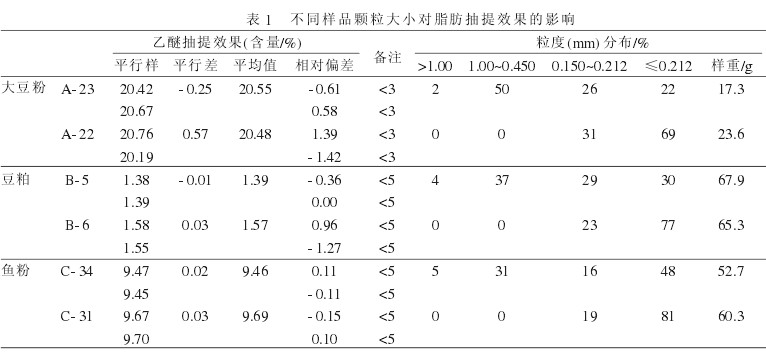 (1)样品颗粒研磨至1.00~以卜,月旨肪抽提效果就可以达到现行国家标准GB/T 6433- 1994的规定;