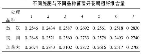 本实验是分析不同施肥对不同品种苜蓿在开花期和成熟期两个时期粗纤维含量的影响,由上述分析可得出最佳施肥方案为尿素60133kg/hm2,过石90178kg/hm2,硫酸钾132kg/hm2.