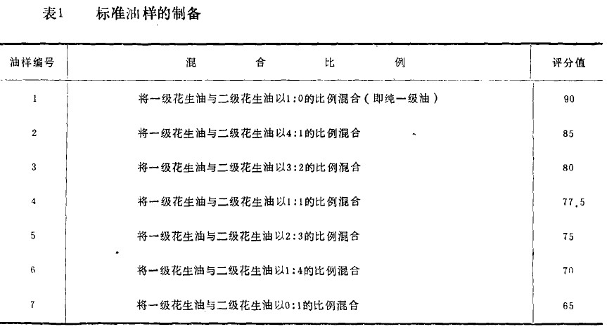 将1、2级花生油按不同的比例棍合,并给混合后的油样打分,一共得到七种不同颜色深度的标准油样,见表1.