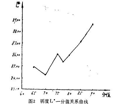 由色度b*一分值曲线,彩度C e、一分值曲线及彩色饱和度S,、一分值关系曲线,可以明显看出,三条直线的相关关系较好,而且由回归方程分析可知,其相关系数分别为0.999,0,998, 0,999,三条直线的回归是高度显著性的(0,01水平以上)。