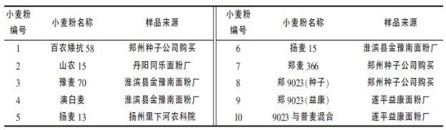 选取16种不同地域的具有代表性的国产小麦进行小麦样品分析,通过实验磨粉制得相应小麦粉,除此之外,还选取10种市售商业粉,包括馒头粉、面条粉、低筋粉,与上述小麦粉一起进行理化指标、粘度仪指标的测定,样品名称和来源如图1,所示。