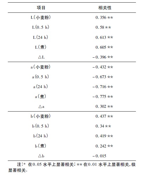 小麦粉色泽测试值与感官评分均呈极显著相关,其中小麦粉a 值与感官评分为负相关,L值与b 值则呈正相关,说明亮度高、偏黄而红度值低的小麦粉感官评分高。面片色泽各项数据均与面条感官评价色泽分数呈极显著相关,其中L值和b值呈正向极显著相关,a值呈负向极显著相关。煮后面条与感官评价相关性大于生面片与感官评价的相关性,这是因为煮后的面片更加接近于品尝的面条。